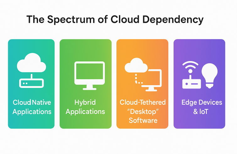 All Modern Software now falls somewhere on what you might call a “Spectrum of Cloud Dependency”. There are Cloud-Native Applications that are 100% hosted and can only be accessed via a web browser. Hybrid Applications include some local components but also have hosted backend APIs ( Slack, Spotify ). Then there’s Cloud-Tethered “Desktop” Software that requires online access for full functionality ( AutoCAD, VS Code Extensions ) as well as Edge Devices & IoT like Smart home tech, wearables, your Tesla, and everything else that connects to your smart phone.
